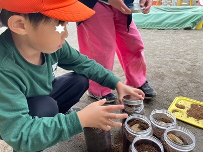 園庭の葉っぱにいたちょうちょを捕まえて、観察。さて、ここまではいつもの年と同じ風景ですが、ある時ご近所の子ども食堂「あかはなスマイルキッズ ゆるり」の方から「カブトムシの幼虫がたくさんあるんだけど、要りませんか?」と声をかけていただきました。早速もらいに行ってみると本当にたくさんの幼虫!