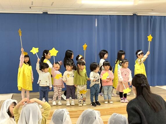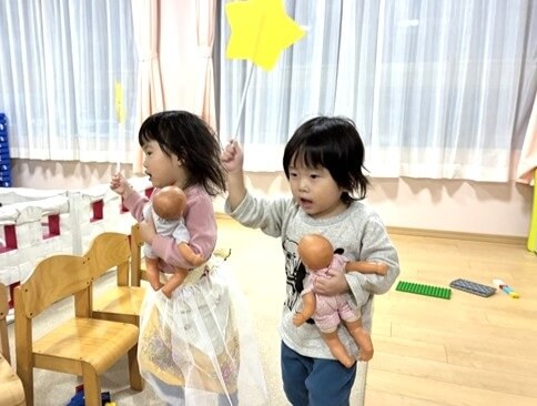 静かな夜の出来事とは思えない明るさだけど…みんなの真ん中にイエス様がいることを、大勢で喜び祝います。2歳のお部屋に戻ってからも、星を手に周りを照らしながら、イエス様を抱え(なぜか双子だけど)、マリアとヨセフは歩き続けます。