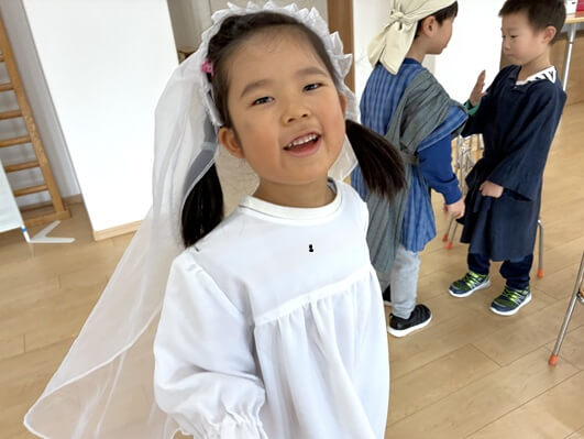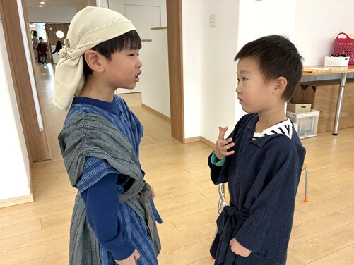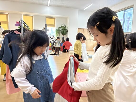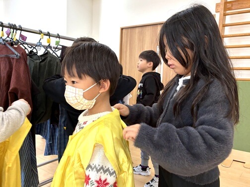 と、年長はと組さんだけで役の入れ替えをしてみたり、別の日には他のクラスの子も仲間入り。本番では着付けを先生たちに手伝ってもらったので、今度は自分がしてあげる番です。