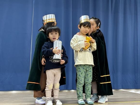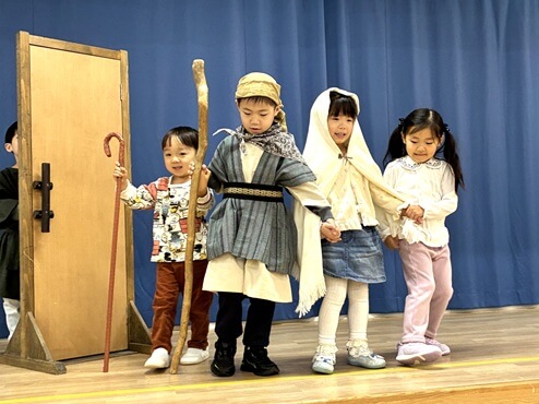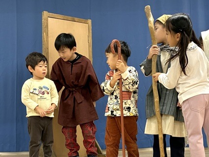 小さく輝く星たちは博士導く大事な役。手にした星が嬉しくて、まぶしいくらいの笑顔です!こっそりとセリフを教えてあげながら、ページェントは続きます。最初にイエス様を拝みに行ったのは羊飼いたち。それから博士たちが捧げものをして誕生を祝います。真ん中には飼い葉おけで眠るイエス様。