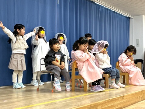 人気の役だと、衣装が足りないこともあって椅子に座っているのは、全員マリアさん。天使のお告げを聞いて神さまにお祈りをしている場面です。