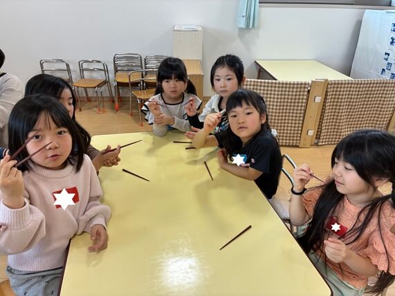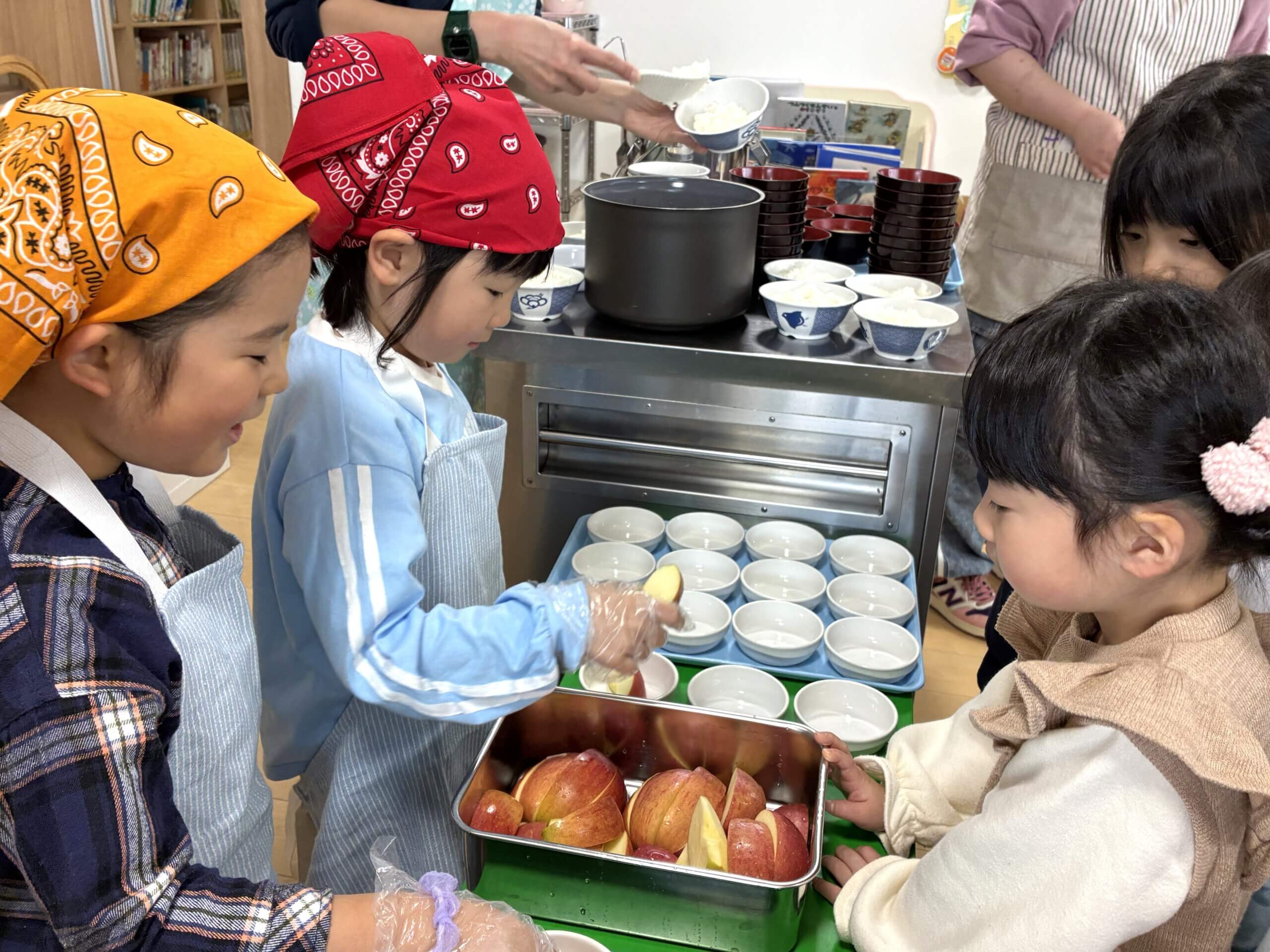 さぁ、小学生になる準備をしなくちゃね。給食は自分たちで配るんだって!小学生は、みんな箸でたべるんだって!はやく学校に、行きたいね。もうすぐ1年生だよ!