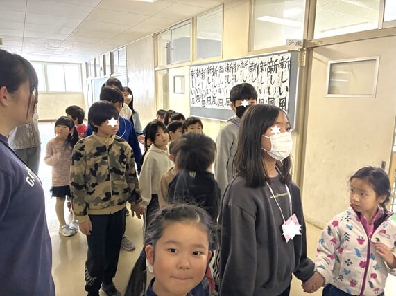 広い校庭ではスキーの練習をしている子ども達もいたので「あ、スキーウエアもってくれば良かった!」「先生もスキー持ってくれば良かった~。」でも玄関で5年生が優しく手を振って迎えてくれたので、さっそく中へ。色々な教室を見せてもらった。