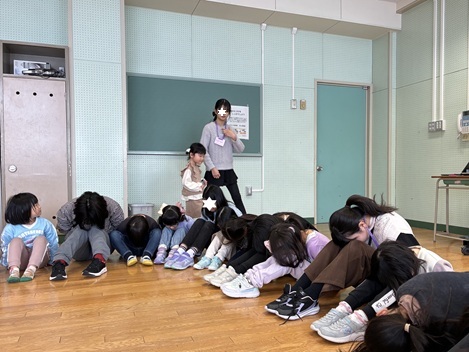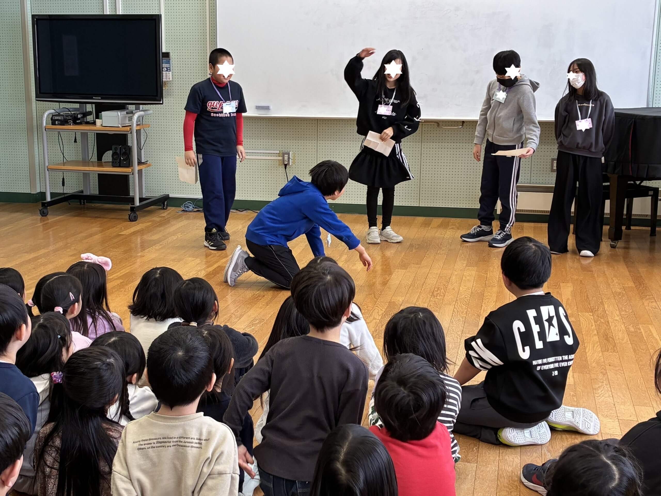 廊下には立派な習字や絵やポスターが貼ってあった。「すいそうがくぶ」と書いたポスターを見てひとりの男の子が「家にもすいそうあるよ。おんなじだね!」「ねえ、その水槽の中には何がいるの?」「さかなだよ。」……女の子がすかさず突っ込む。「『がくぶ』ってついてるから、ちがうんじゃない?字はさいごまで読まないとだめなんだよ。」それから教室で一緒にハンカチ落としをすることに…リレーのアンカーだったNちゃんは全速力で走り、ちょっと手を抜いてくれた5年生に見事タッチ!ジェスチャーゲームは、わかりやすいように、体を大きく動かしてくれて、さすがは5年生!楽しい時間はあっという間。もう帰る時間なの?園に戻ったら、お手紙を書かなくちゃ!
