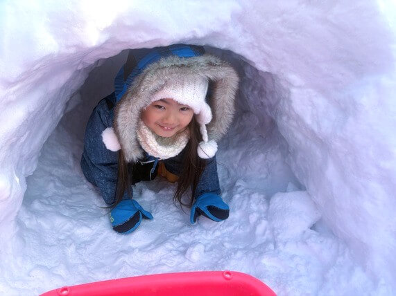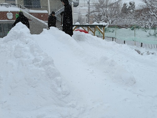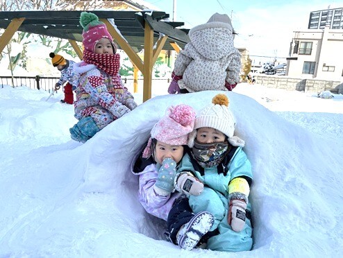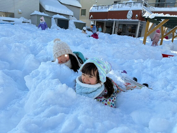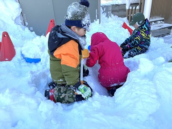 園庭にはふっかふかの雪!掘ったり、積んだりどんどん積んで、また掘って、かまくらの中は、あったかいよ~かまくら、大きくなってきた!2人でも入れるよ。小さい穴のかまくらは登っても大丈夫!安全が大事だから、避難の道はちゃんと作っておこう!先生、手伝うよ!