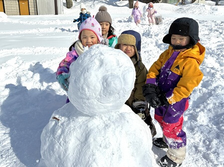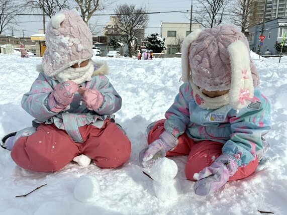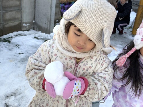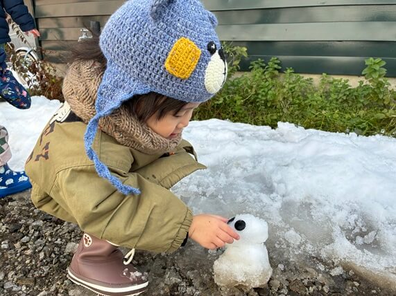 手のひらサイズの雪玉をくっつけて…「雪だるま、できた!」