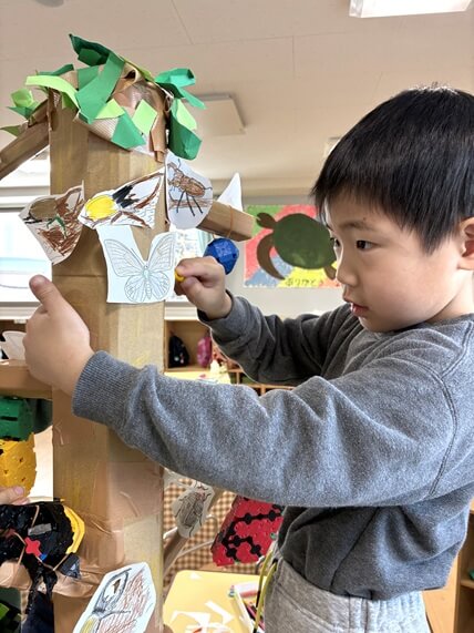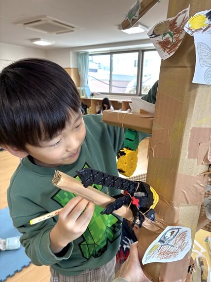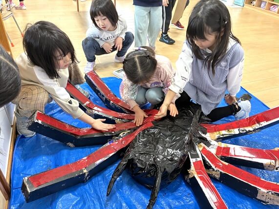 さなぎから羽化したアゲハ蝶を空に放した時の感激も忘れない。そして、今、再現を超えて創造されている虫たちの世界。それは巨大なタランチュラとカマキリ!秋に作った恐竜博物館の熱が心の中にまだ残って、「やりたい!作りたい!」足の色は茶色や黄色なども混ぜたオリジナルのクモ色。足の裏は赤くして毒毒しさを増していきます。卒園を前に「なせ今?」と思うけれど、目を輝かせながら語り合い、夢中になって作り上げていく子どもたちの姿は生き生きとしている。