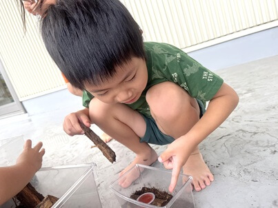 コバエと戦ったカブトムシの飼育。図鑑で調べながらお世話したオオカマキリ。Mちゃんが連れてきたミミズとオオカマキリの戦いは……凄まじかった!