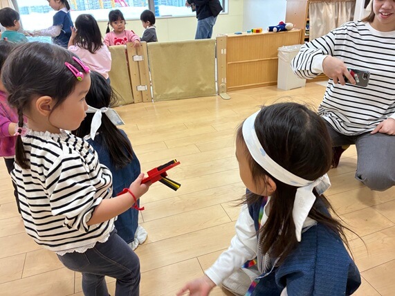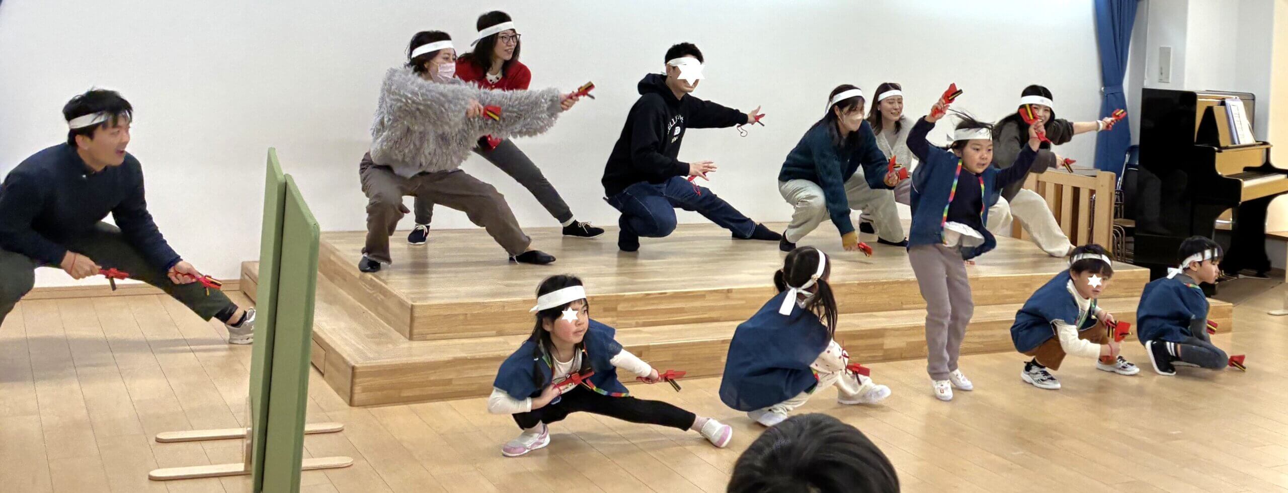 お楽しみ会の当日、お父さんお母さんはちょっとだけ練習をして一緒にステージへ。子ども達が前で踊ってくれるので、ちょっとくらい間違えても平気です。そこは度胸と勢いで!