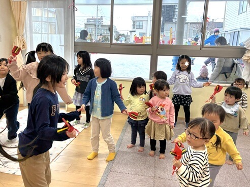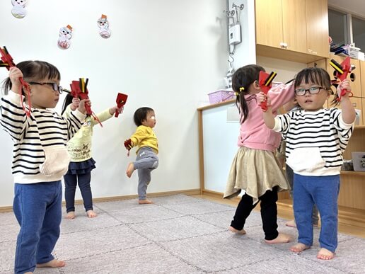 初めて鳴子を手にしたひよこさん達。