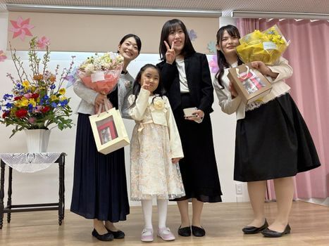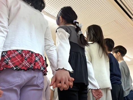 さぁ、ホールでは先生や家族の人が待っている。入場の曲が流れるとリラックスから一変してみんなの背筋がすっと伸びる。最初に神さまに感謝の礼拝。「神さま、いつもみんなのことを守って、こんなに大きく育ててくれてありがとうございます。いつまでもずっと私たちのことを守ってください。」