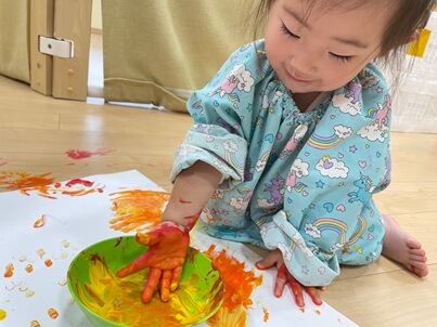 園からのお知らせ 秋は芸術! 絵具を手につけて…手のひらペタペタ、指先もペタペタ。芸術には、繊細さが必要。細かいところは両手で丁寧に…道具も使って勢いよく大胆に!みんなで作る芸術の世界。床にも楽しい世界が!ひよこ美術館、ただいま絶賛開催中です! 2025.09.30 園からのお知らせ